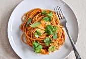 Спагетти по-индийски - с морковью, горохом и фасолью в томатном соусе со специями.