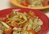 Лук-порей, чеснок и помидоры, обжаренные в масле, с вашей любимой пастой.