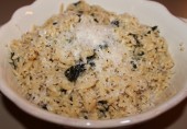 Паста орзо, сваренная на курином бульоне, с тертым пармезаном и свежим базиликом. Можно добавить немного оливкового масла.