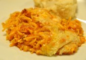 Равиоли, политые соусом из консервированных помидоров со специями, посыпанные тертым сыром и запеченные в духовке.