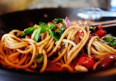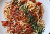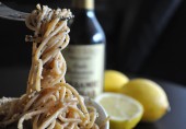 Спагетти с лимонным соком и соусом из оливкового масла, измельченного чеснока, бальзамического уксуса, тимьяна и базилика.