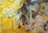 Паста пенне, запеченная с обжаренным говяжьим фаршем, соусом тако и сливочным сыром, посыпанная тертым чеддером и колби.