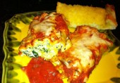 Роллы из лазаньи с начинкой из курицы и сыров, политые соусом для спагетти.