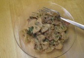 Паста фарфалле под сливочным соусом с беконом, вялеными помидорами и шпинатом.