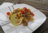 Паста фузилли под овощным соусом с копченой колбасой и специями. Добавьте немного лимонного сока - и можете подавать!