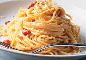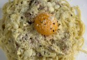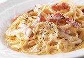 Паста алла карбона́ра (итал. Pasta alla carbonara) — спагетти с мелкими кусочками гуанчиале (соленой некопченой итальянской свиной щековины), смешанные с соусом из яиц, сыра пармезан и пекорино романо, соли и свежемолотого черного перца.