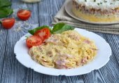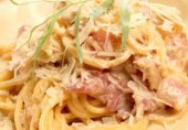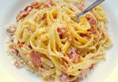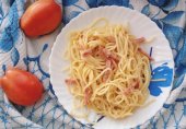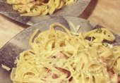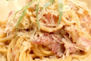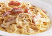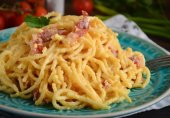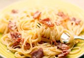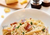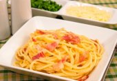 Паста карбонара – это спагетти с тонкими ломтиками бекона, залитые сверху соусом из яиц и сыра. Этот соус доходит до полной готовности от жара только что сваренной пасты.