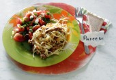 Режим на мелкие кусочки куриное филе. Отправляем все на хорошо подогретую сковородку и прожариваем.Когда обжарили с двух сторон мясо добавляем помидоры,перемешиваем и прожариваем вместе с мясом (минут 5-7)В этот момент варим макароны и трём на большой терке плавленный сыр.
