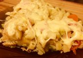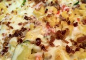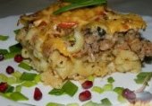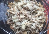 Паста с обжаренным фаршем, кабачками, помидорами и луком, посыпанная моцареллой и запеченная в духовке.