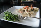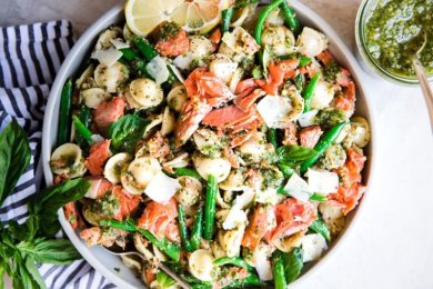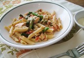 Паста с запеченной спаржей, лососем и помидорами в сливочно-сырном соусе.