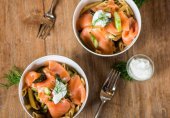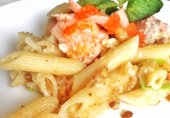 Паста и филе копченого лосося в сливочном соусе с луком и чесноком, запеченная в духовке и посыпанная свежим укропом.