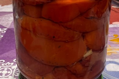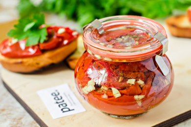 Помидоры, подсушенные в духовке и уложенные в банки вместе с растительным маслом, чесноком и специями.