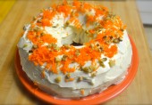 Морковный пирог с ананасами, кокосовой стружкой и орехами, покрытый сливочной глазурью.
