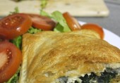 Пирог из слоеного теста с начинкой из шпината, сыра фета и кедровых орешков.