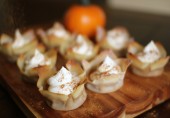 Маленькие пирожки из листочков теста Вон Тон с начинкой из тыквенного пюре, творога и специй, украшенные взбитыми сливками.