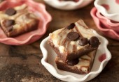 Пирожные из двух слоев - брауни и чизкейка, посыпанные шоколадными чипсами.