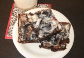 Брауни с раскрошенным печеньем орео, политый ванильной глазурью.