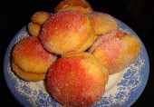 Печенье, сложенное в виде персиков, склеенное сгущенкой, окрашенное морковным и свекольным соком и посыпанное сахаром.