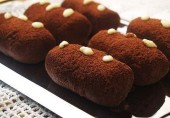 Пирожные из шоколадного бисквитного теста с рубленым лесным орехом (фундуком), покрытые молочным и белым шоколадом.
