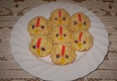 Пирожные из бисквитного теста в виде цыплят, испеченные в форме для мини-кексов, смазанные взбитыми сливками и посыпанные раскрошенными кукурузными хлопьями (или палочками) с кокосовой стружкой.