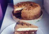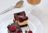 Нежные брауни-бисквиты, ванильный мусс с маскарпоне, тонкая прослойка вишневого желе, шоколадная глазурь и шоколадный мусс.