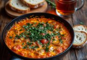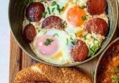 Завтрак 🍳. В менемене яйца взбивают и перемешивают с соусом, как в омлете. Также менемен имеет простой соус с акцентом на свежие овощи, а специи используются умеренно, обычно только красный перец.