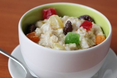 Геркулесовая каша с бананом, черносливом и цукатамиЭта кисло-сладкая каша похожа на десерт, в котором банан заменяет нежный крем.