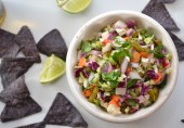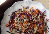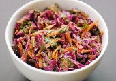 Легкий витаминный салат из белокочанной и краснокочанной капусты с луком, морковью, редисом и перцем халапеньо, заправленный винным уксусом с соком лайма.