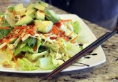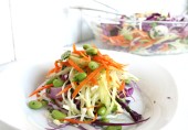Легкий тайский салат из салатной зелени с капустой, морковью, орехами кешью и авокадо, заправленный арахисовым маслом с имбирем, чесноком, чили, рыбным и соевым соусами.