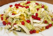 Салат из отварных кальмаров с огурцами, пекинской капустой и зеленью, заправленный подсолнечным маслом с лимонным соком и украшенный зеленью и зернышками граната.