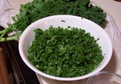 Салат из листьев капусты кале с тертым сыром, чесноком и сухарями, заправленный оливковым маслом и лимонным соком.