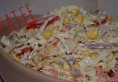 Салат с капустой и крабовыми палочками — недорогой и простой в приготовлении вариант закуски. Блюдо отлично подойдет для торжественного мероприятия в офисе или дома.