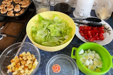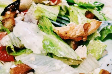 Классический салат с курицей, салат айсберг, сыр, перепелиные яйца, сухарики, соус цезарь.