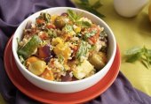 Тёплый картофельный салат с копчённой колбаской, маринованным огурчиком и лёгкой кислинкой.