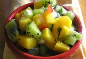 Освежающая сальса из манго с консервированным ананасом, свежими овощами и зеленью, заправленная соком из-под ананаса.