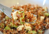 Салат из киноа с овощами, мексиканским сыром и оливками, заправленный оливковым маслом и соком лайма.