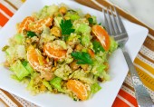 Попробуйте богатый белком салат из нута с киноа, огурцом, фисташками и мандаринами, заправленный апельсиновым соусом.