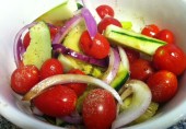 Салат из огурца с виноградными помидорками и луком, заправленный оливковым маслом и бальзамическим уксусом.