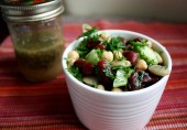 Салат из свежей свеклы, с луком, морковью, огурцами, помидорами, свежей и сушеной зеленью, лимонным соком, кукурузным маслом и морской солью.