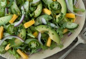 Салат из авокадо с мандо, огурцом, рукколой и перцем халапеньо, заправленный апельсиновым соком с винным уксусом и оливковым маслом.