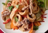Легкий и ароматный салат с жареными кальмарами и огурцом