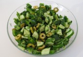 Зеленый салат отлично подойдёт к мясным блюдам, но его вкусно есть и просто так - оливки придают ему пикантный вкус.