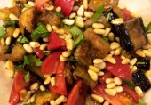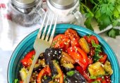 Готовим теплый салат с баклажанами, мясом и овощами.