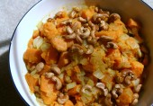 Салат из отварного сладкого картофеля с орехами кешью, жареным луком и порошком карри.