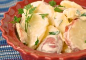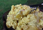 Салат из красно-коричневого картофеля с луком, сельдереем, майонезом, горчицей и кайенским перцем.