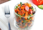 Салат из запеченного сладкого картофеля с сладким перцем, халапеньо, чесноком и консервированной фасолью, заправленный оливковым маслом.