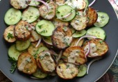 Салат из приготовленного на гриле картофеля с огурцом и луком, заправленный майонезом с чесноком, дижонской горчицей и семенами сельдерея и посыпанный свежей зеленью.