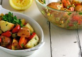 Салат из отварного картофеля, заправленный лимонным соком и соусом из майонеза, йогурта, зелени и цедры лимона.