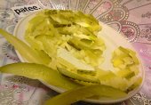 Трационное сочетание соленого огурца с картофелем, луком и молотым перцем с добавлением подсолнечного масла дает пикантный вкус.