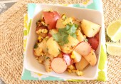 Свежий салат из красного картофеля, сладкой кукурузы и летних овощей.